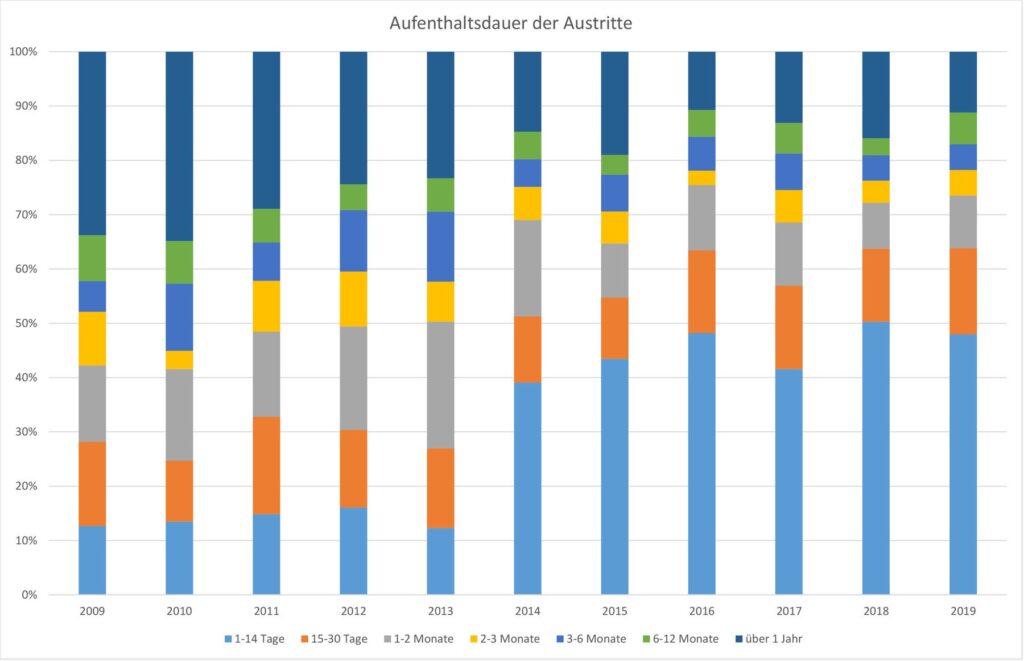 Vor 10 Jahren sind 28 Prozent aller Bewohnenden nach 30 Tagen aus dem Pflegezentrum ausgetreten, 2019 traten 64 Prozent nach spätestens 30 Tagen aus.
